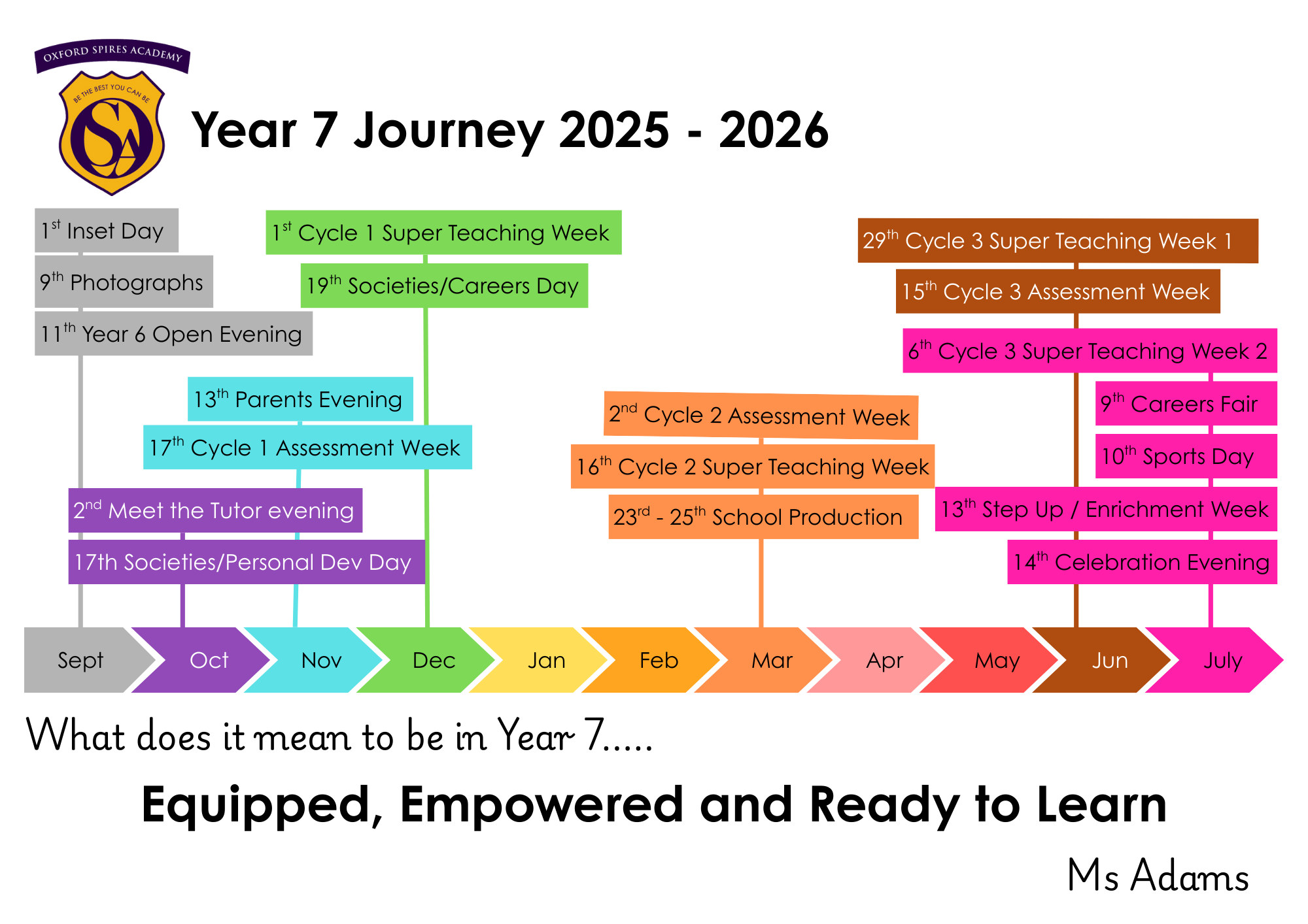 We also want to empower you. Reading is at the heart of everything we do at Oxford Spires Academy. Strong literacy skills are the foundation of all learning, enabling you to access and excel in every subject. We will work on improving your reading, writing, and communication abilities to ensure you are the best you can be. There are many exciting opportunities in Year 7—from sports teams and clubs to a wide range of enrichment activities and our fantastic team-building activity day. While we work hard, we also make sure that we enjoy school life. We expect our Year 7 students to make the most of this first year at Oxford Spires Academy and make every day count.