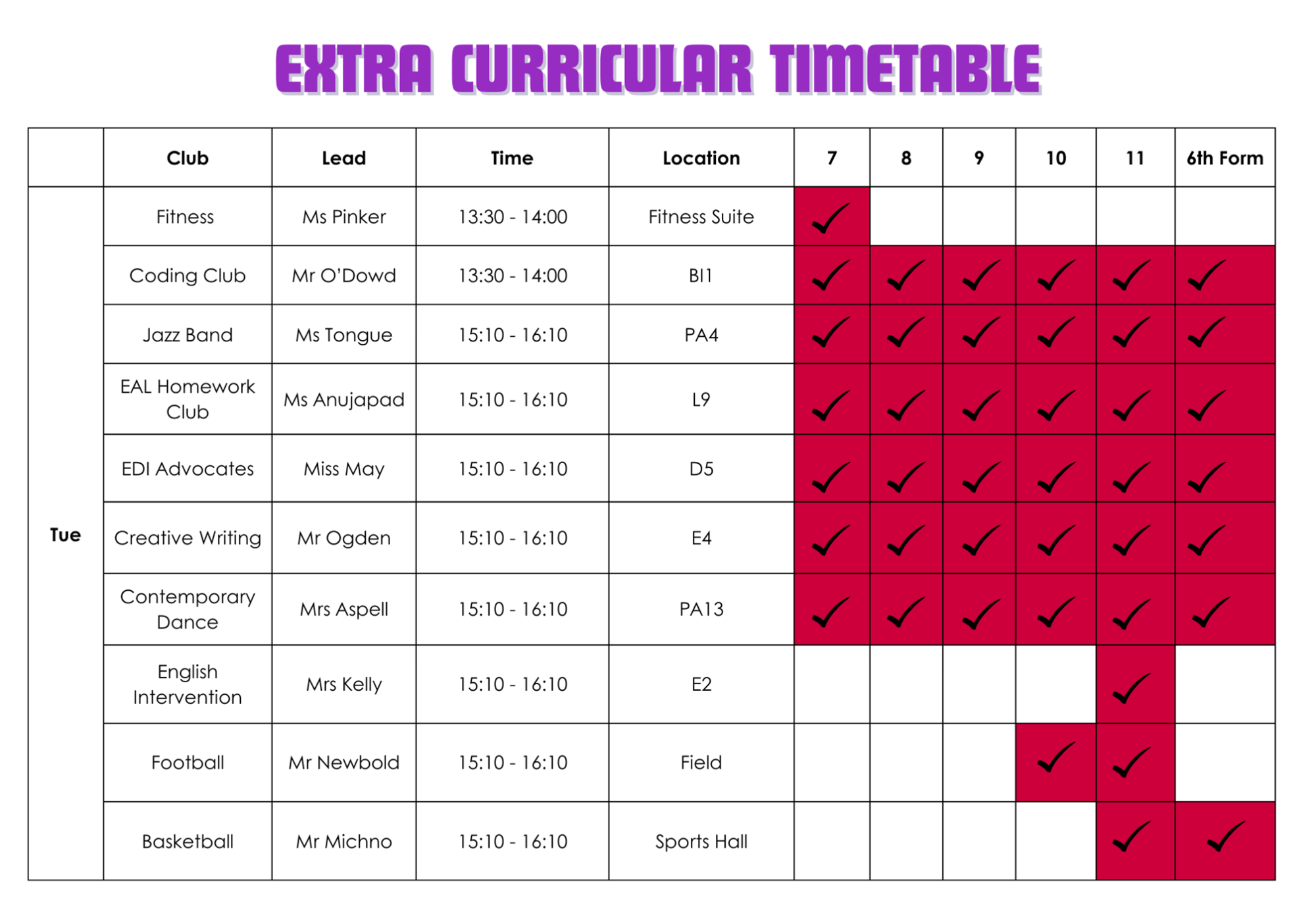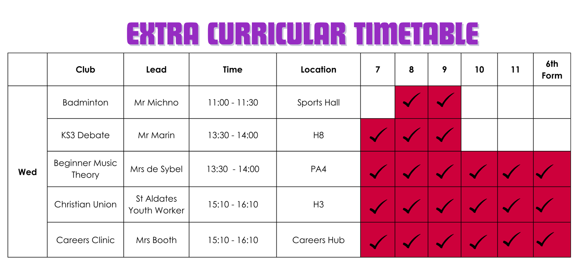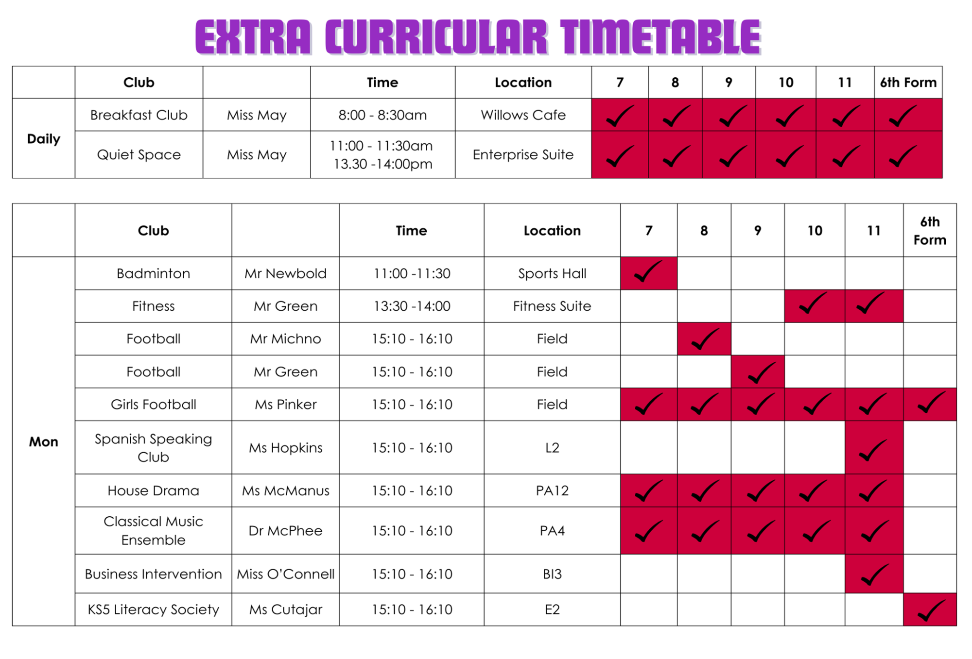 | Day | Year 7 | Year 8 | Year 9 |