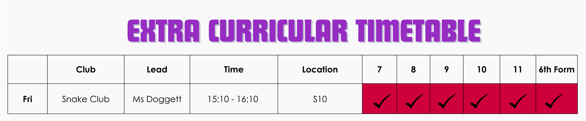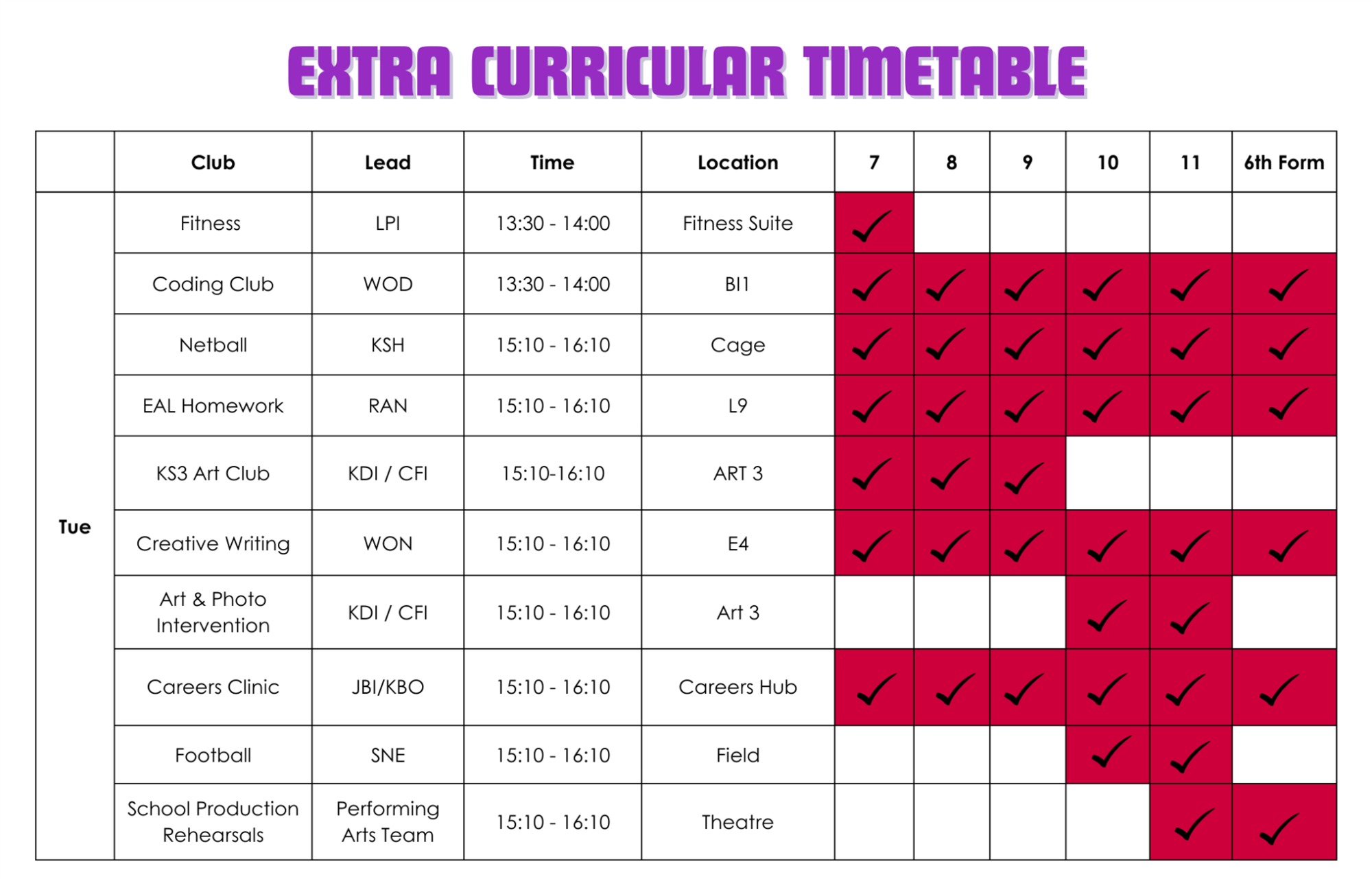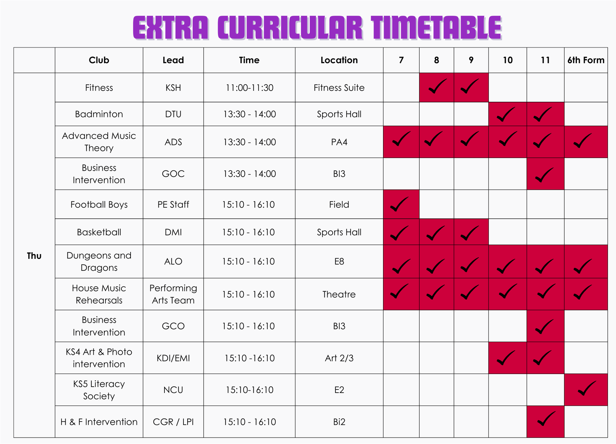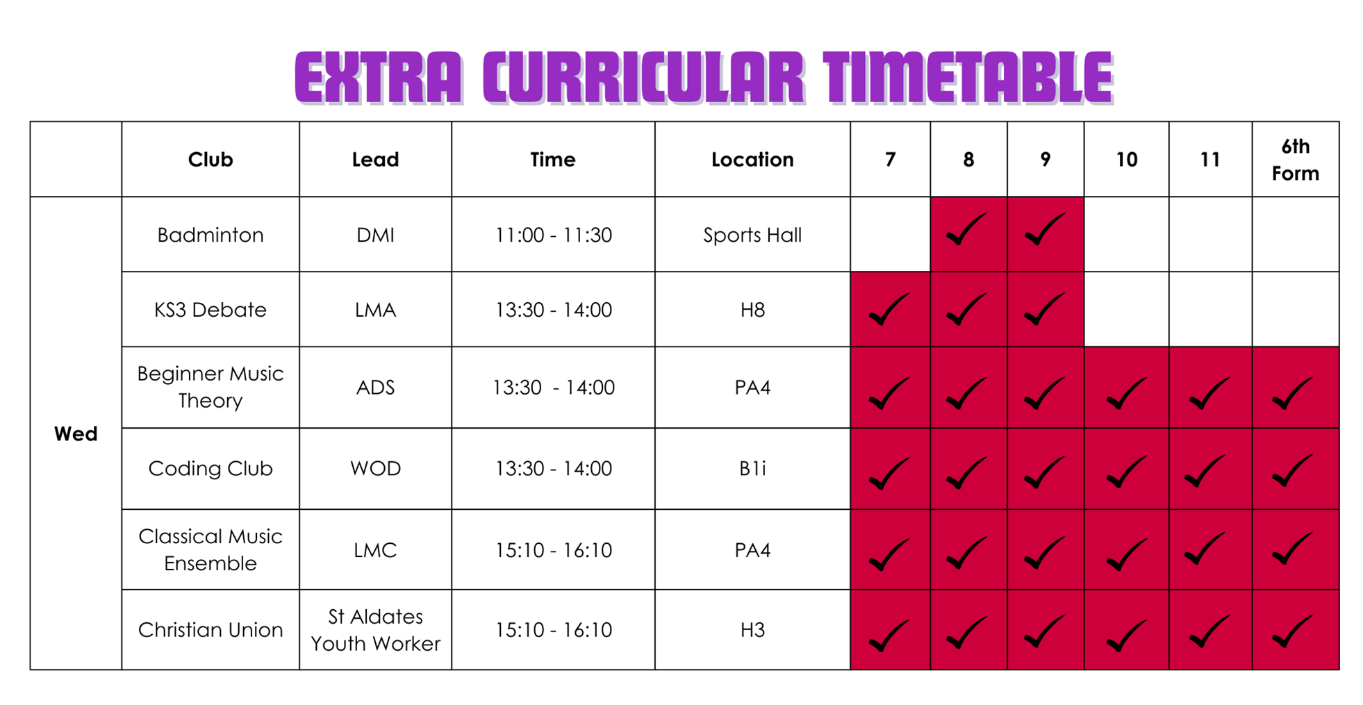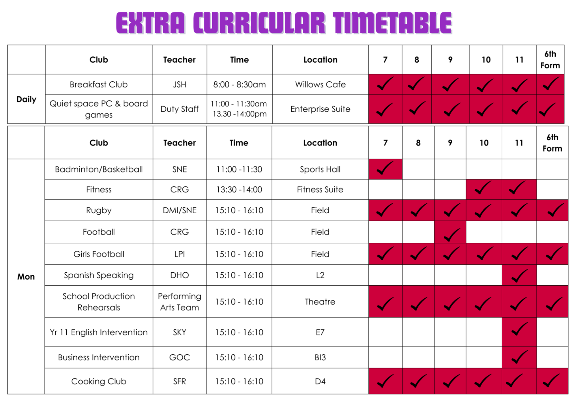 | Day | Year 7 | Year 8 | Year 9 |